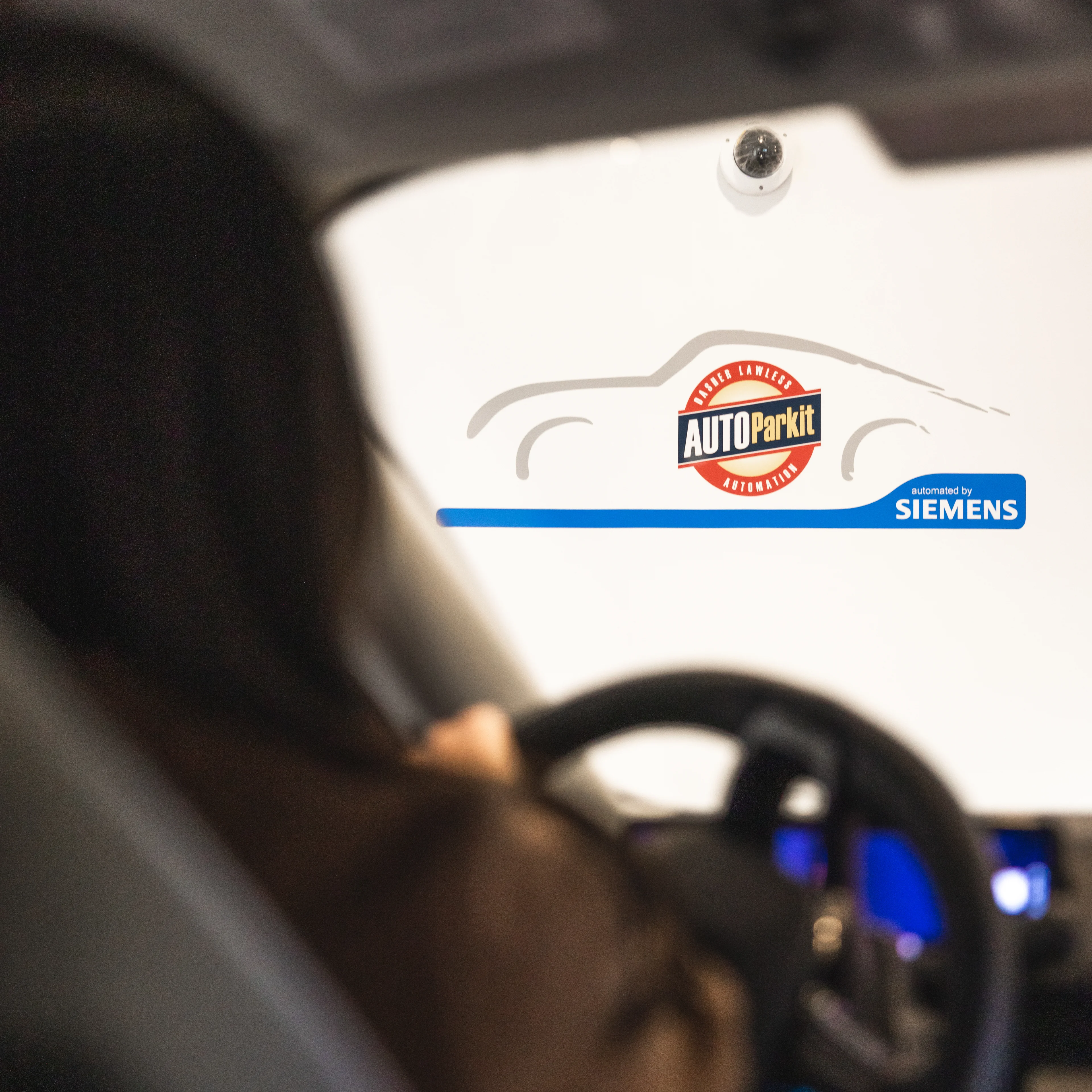 A flat-screen monitor, sensors, and cameras help to guide the driver to pull their car onto a pallet inside the Load Bay.