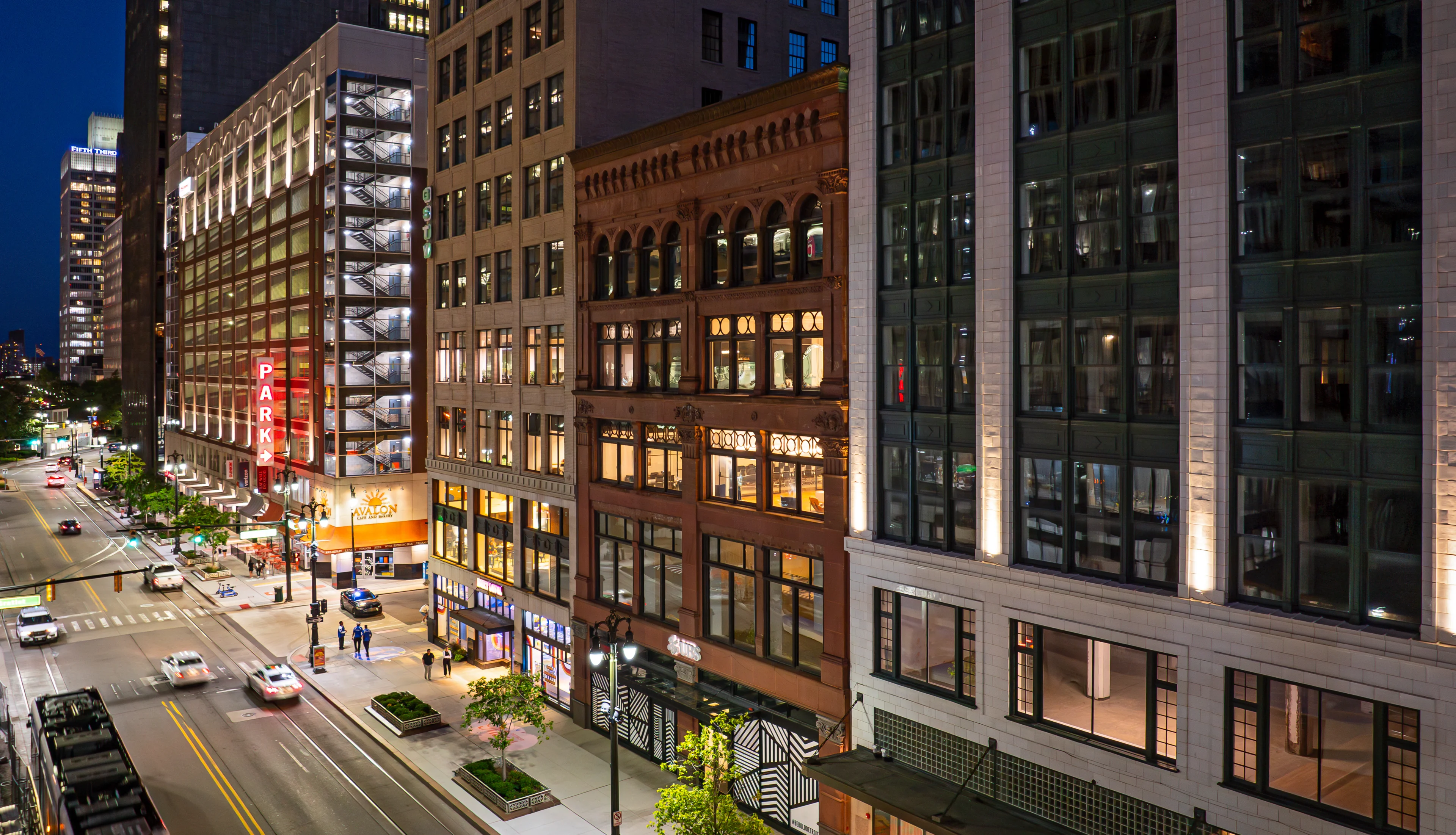 Designed by architect Gordon Lloyd and originally constructed in 1890 for a clothing store, 1217 Woodward was renovated in 2018 by architecture firm Kramer Design Group and converted into offices and street level retail. This five-story brownstone offers an unmatched Woodward Avenue location across from the vibrant Hudson’s Detroit mixed-use development, just blocks from Detroit’s Campus Martius Park and Capitol Park neighborhoods. Notable features include historic detailing, a central historic atrium penthouse office suite and a recent lobby renovation that restored the original skylight and interior gold leafing.