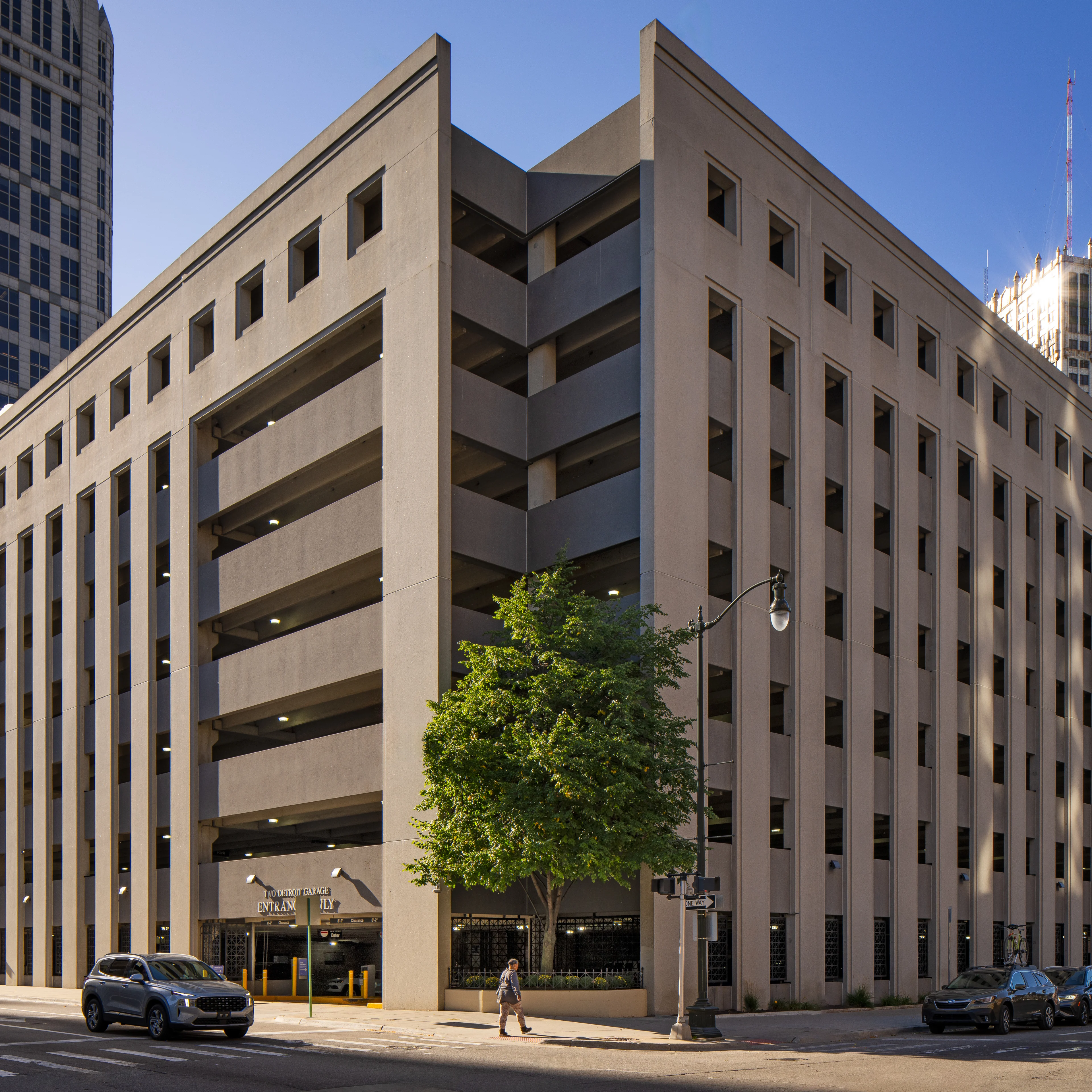 One Detroit Garage is a seven level parking structure with daily and badge-holder access available. The garage features electric vehicle charging stations, a complimentary air pump and window washing stations. Garage parking access may also be managed online through Parking.com.