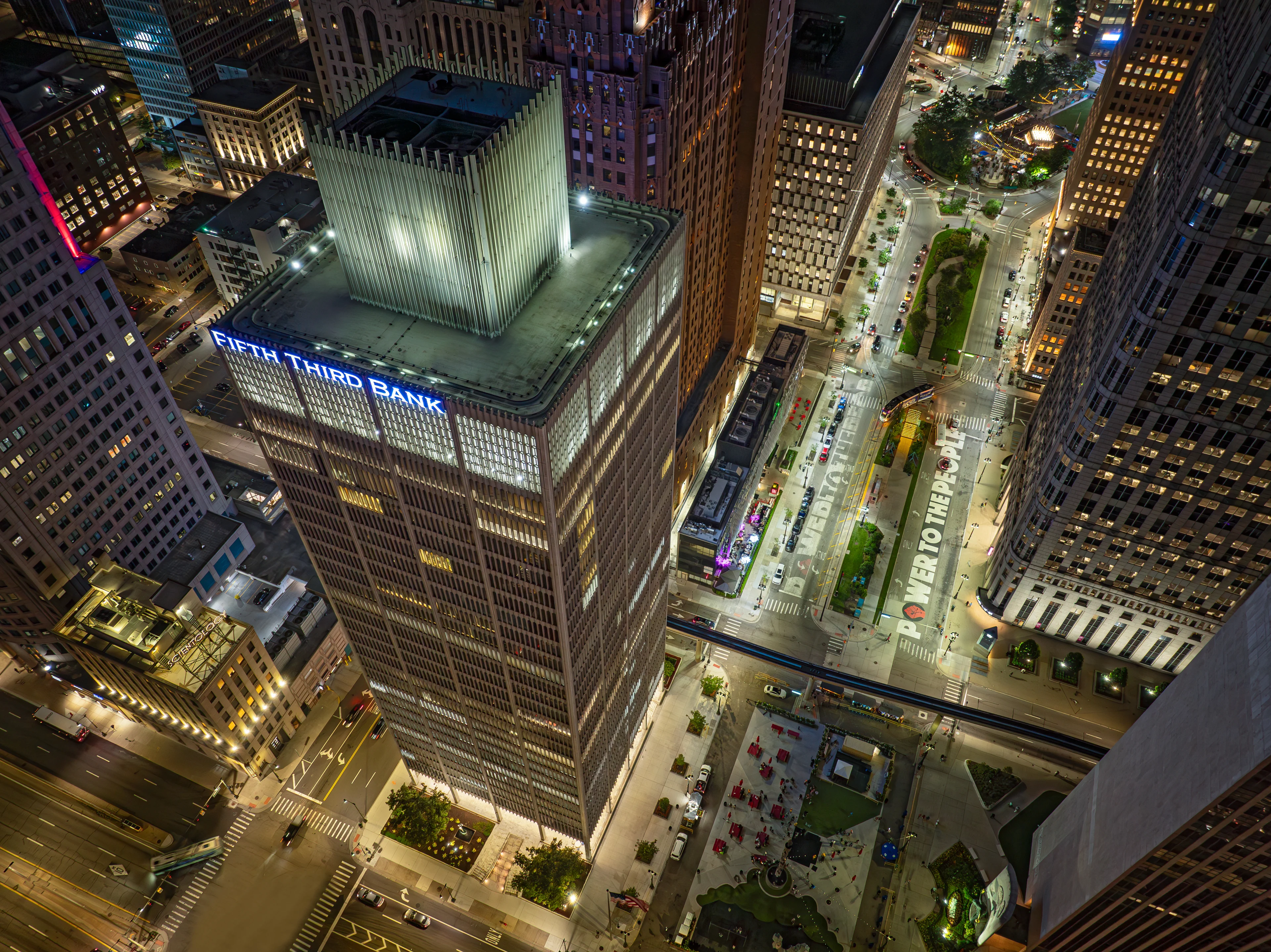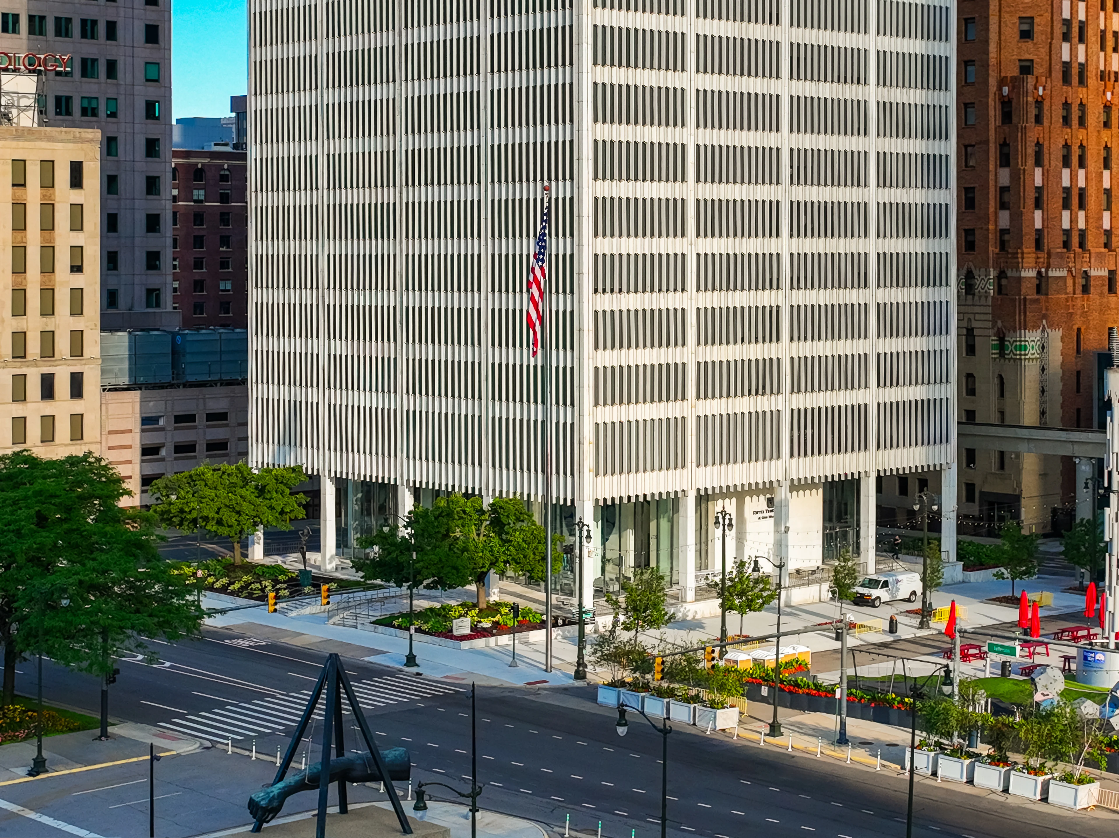 One Woodward offers modern, flexible Class A office spaces with floor-to-ceiling windows and sweeping views of Hart Plaza and the Detroit River. The 28-story building provides a range of office suites—including merged units—from approximately 180 to 26,160 square feet, suitable for both full-floor users and multi-tenant configurations. The building features amenities such as a glass-enclosed atrium, a wraparound terrace, event and meeting space, below-grade valet parking and a planned 10,000 square foot tenant lounge. Notable tenants include Fifth Third Bank, Kitch and Rocket Mortgage. Its prime downtown location provides access to nearby major highways, dining and retail.