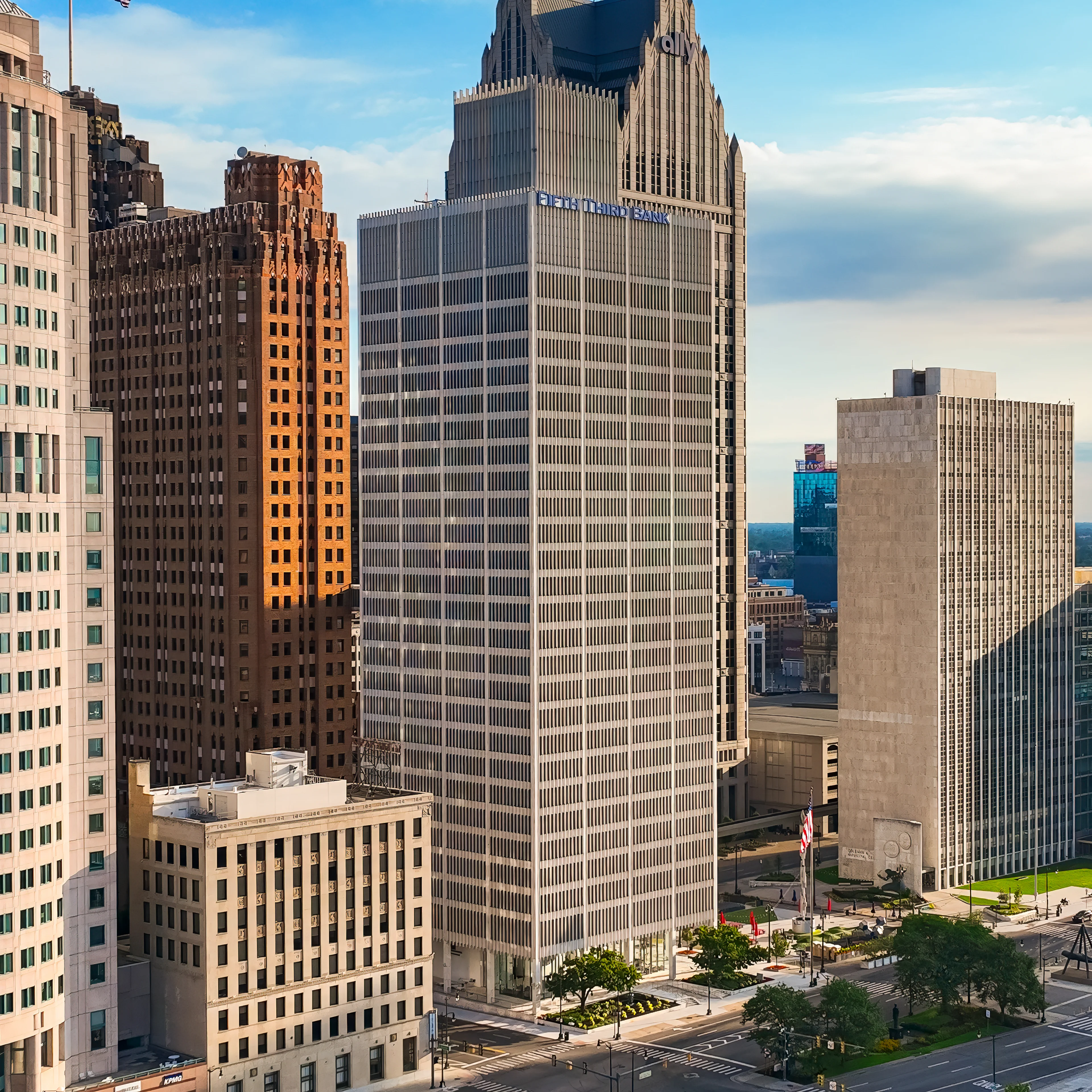 Completed in 1963, the landmark One Woodward was designed by renowned architect Minoru Yamasaki and his first skyscraper. Rising 28 stories above Hart Plaza and the Detroit River, the tower is defined by its striking white marble façade and Yamasaki’s signature rooftop latticework. Today, the 449,000-square-foot building offers modern office space with sweeping river and city views, alongside premium venues for meetings and events.