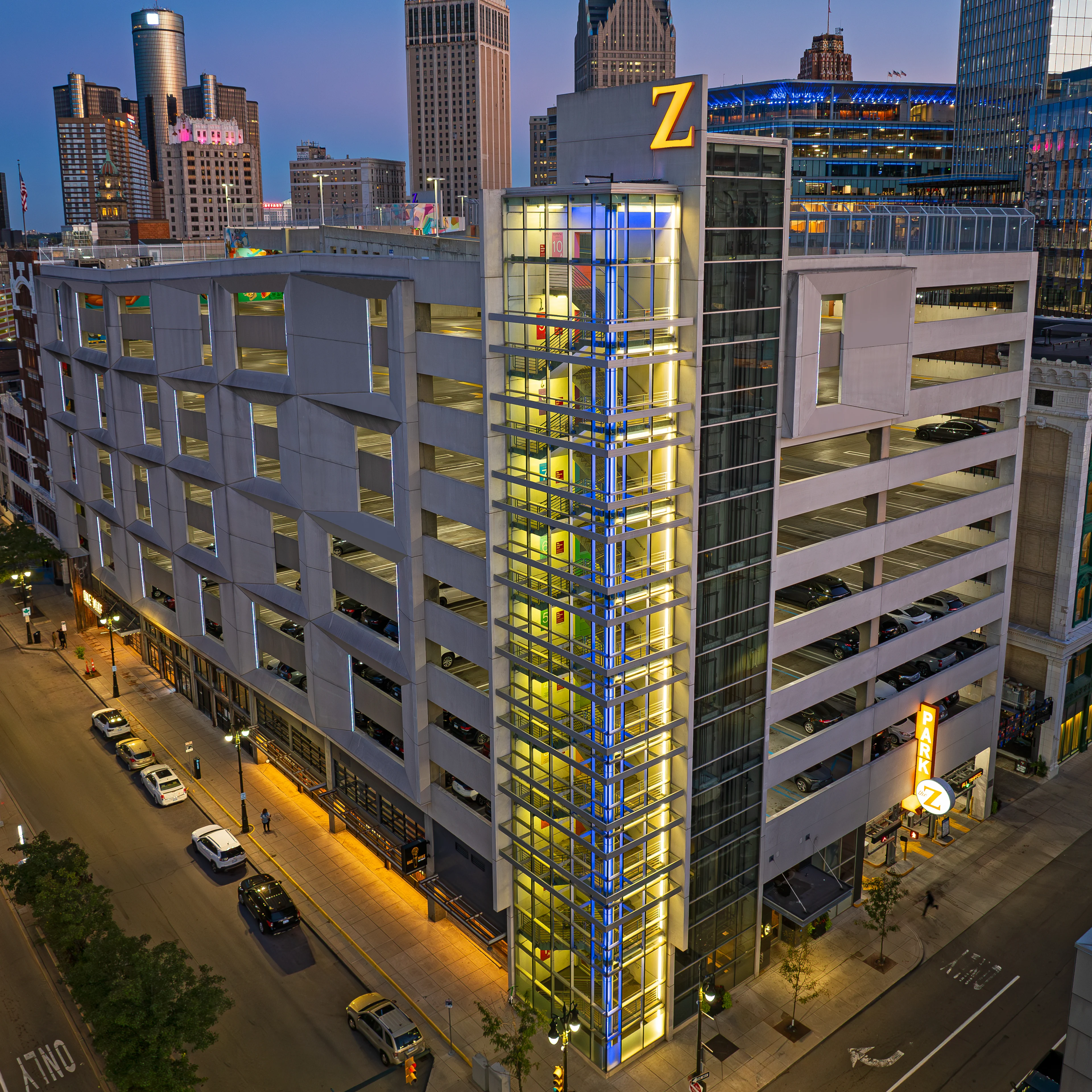 The Z Garage, located at 1234 Library Street, spans a city block and offers 1,287 parking spaces within Detroit’s Central Business District. The garage is bordered by Grand River Avenue, Library Street, Gratiot Avenue and Broadway Street, placing it steps from The Belt, Parker’s Alley, Campus Martius Park and Hudson’s Detroit. Known for its public art, The Z also features a multi-level mural installation featuring local and international artists. The garage includes ground-floor retail, including Mootz Pizzeria + Bar, 7greens, Citizen Yoga and Survived Streetwear.
